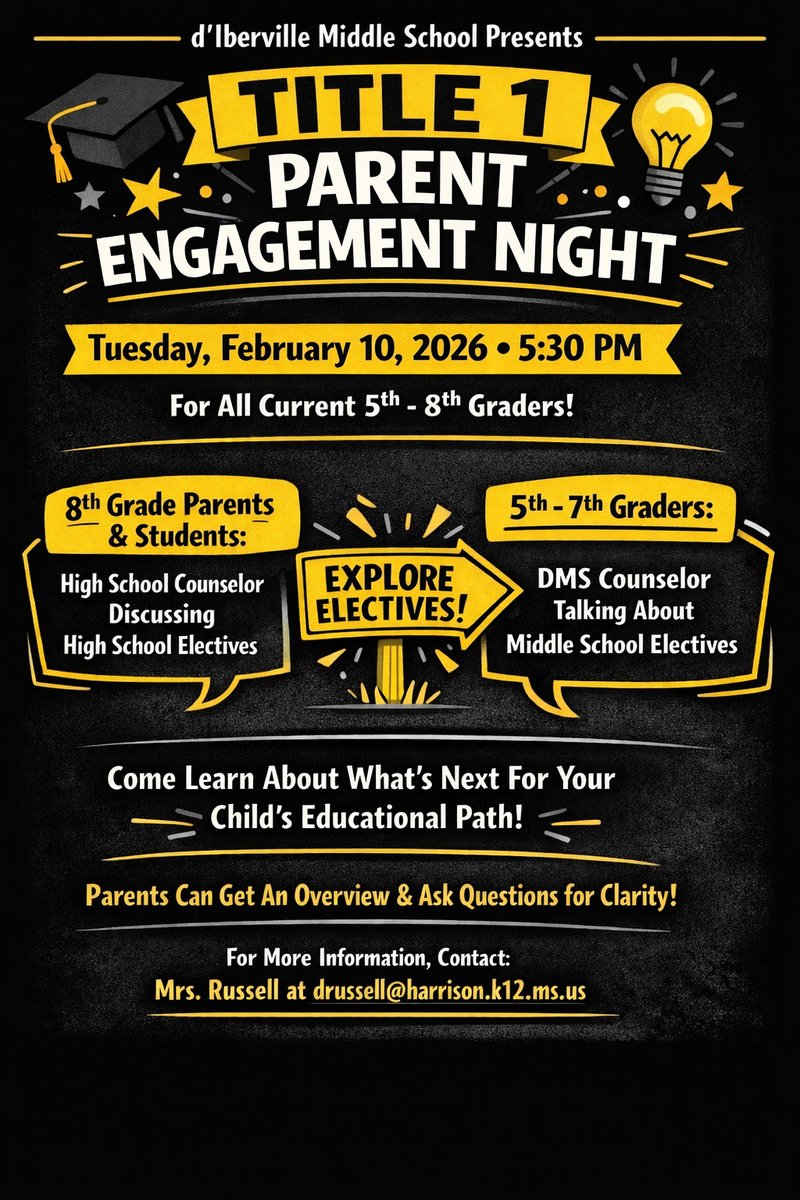 Welcome to D’Iberville Middle School, a diverse learning community where the administration, faculty, and staff focus on the safety and well-being of students while striving for academic excellence in the classroom. At DMS, our dedicated faculty members serve over 500 students ranging from fourth to eighth grade. Recognizing the importance of preparing our students to compete in a global society, we offer them a state-of-the-art learning environment that includes Internet access in all classrooms, seven computer labs on campus, and ten laptop carts with full mobility and Internet access. DMS is equipped with a fully automated library and media center to serve our students. Additionally, our school offers a variety of educational programs such as remediation assistance, gifted courses, advanced courses, and online curricula that focus on enriching the growth and academic achievement of each child at DMS. Each teacher can meet individual student needs by utilizing resources that allow them to profile the past and present performance of the student. In turn, each student is challenged to meet his or her goals while setting new ones.