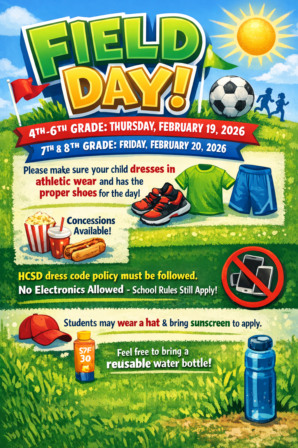 Field Day is almost here! 4th–6th grade: Thursday, February 19 7th–8th grade: Friday, February 20 Please make sure your child is dressed appropriately to participate in all activities. Students sho...