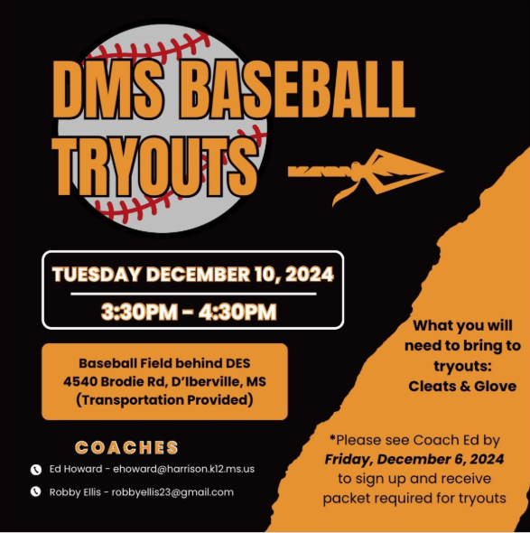 Please see the attached flyer for information regarding DMS Baseball Tryouts for any current 7th and 8th grade boy! ⚾️💪 Tryouts will be held tomorrow!