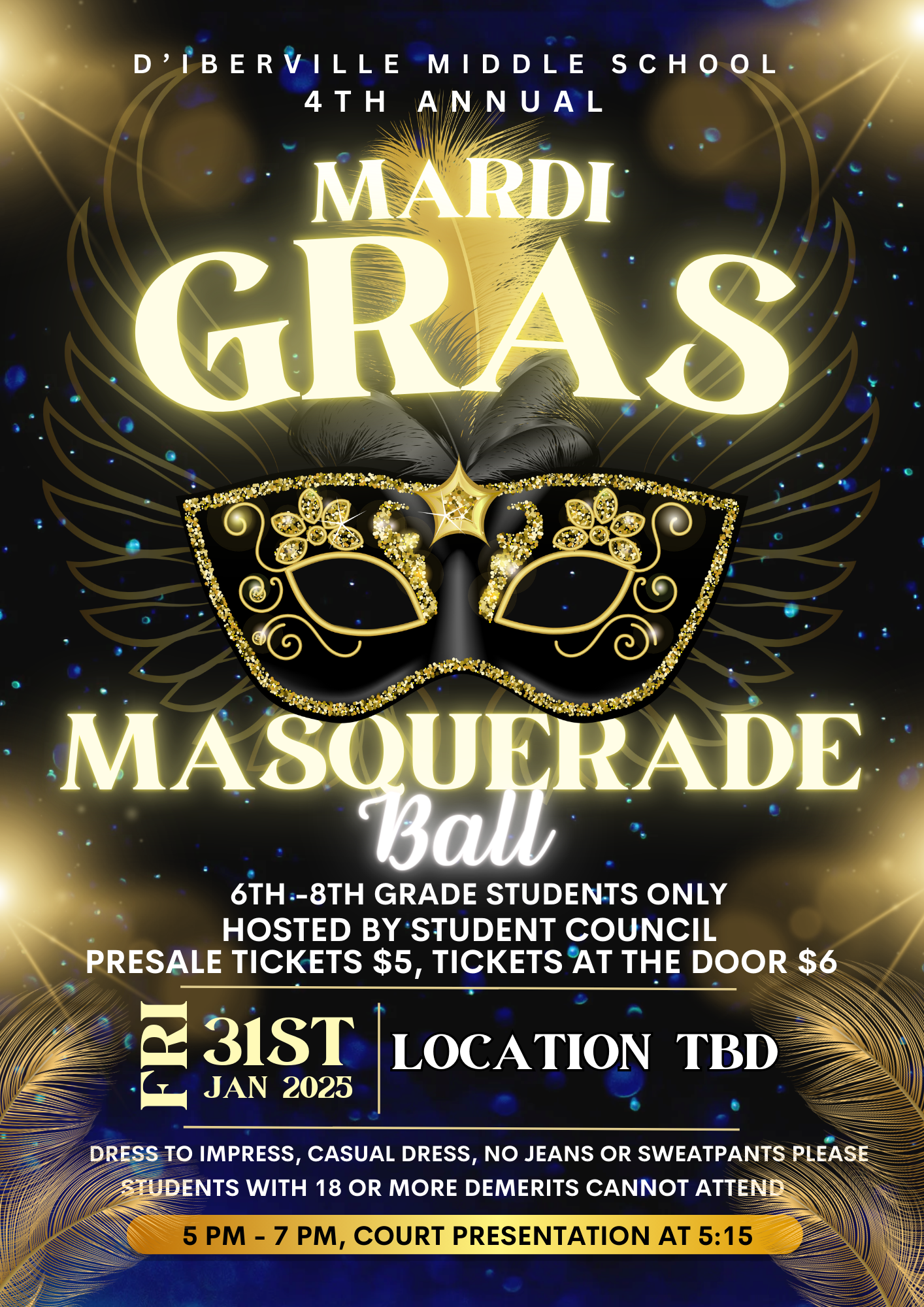Our 4th Annual Mardi Gras Masquerade Ball will be held Friday, January 31, 2025, from 5 PM - 7 PM! The dance is for 6th through 8th grade ONLY. Any student with 18 or more demerits will not be allowed to attend the ball. Location of the ball will be announced closer to the date! 💜💚💛